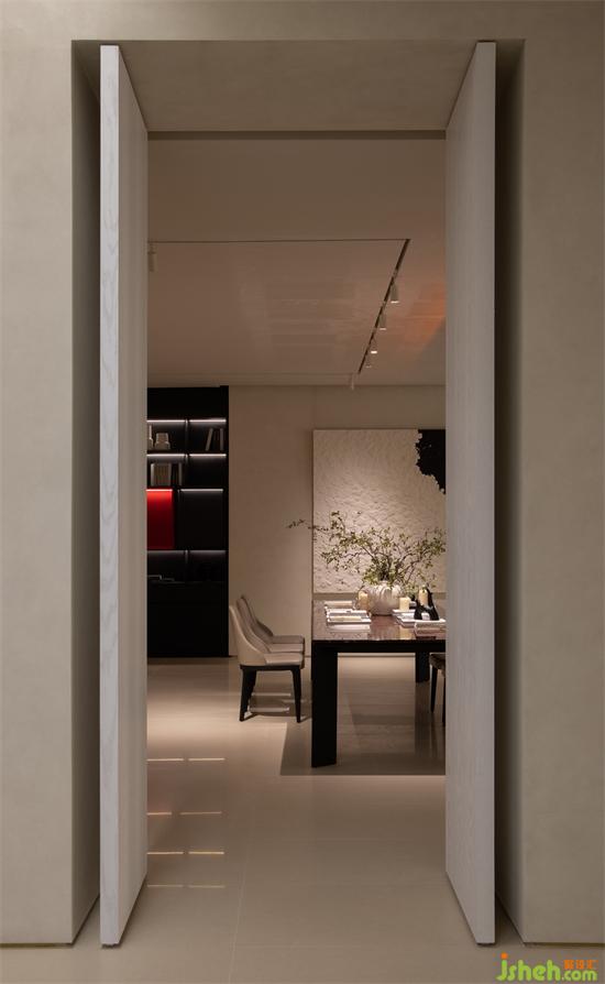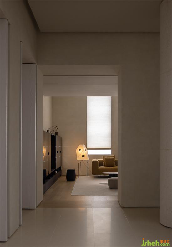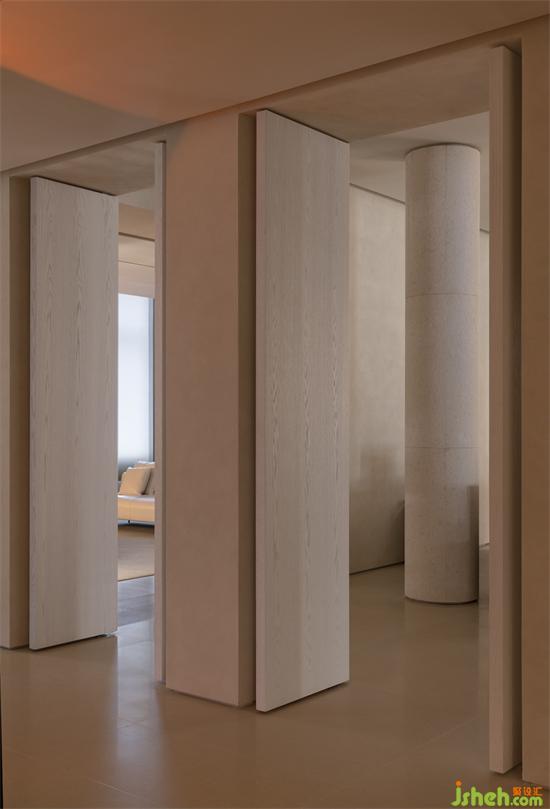 在角落的位置放置了一根自然石柱,將天與地縱向連接的同時(shí),橫向的空間開始變得流動(dòng)起來,真是神奇的依靠,就像在草原上的人們總是會(huì)找到巖石或者樹木休息與依靠作為庇護(hù)。