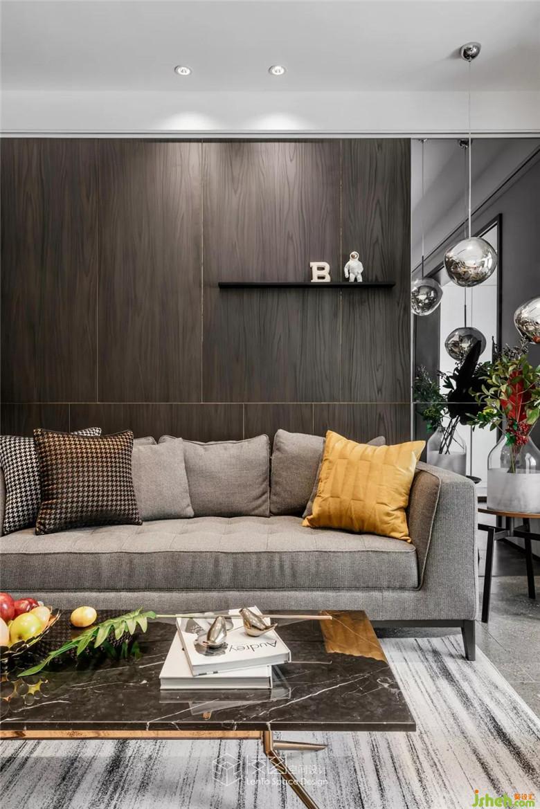客廳一組灰色的布藝沙發(fā),與整體色調相呼應,L型的區(qū)域造型可以容納家中多人的休息,沙發(fā)上精心搭配色彩質地不一的靠墊,室內設計師使得這個空間更加的多姿多彩。