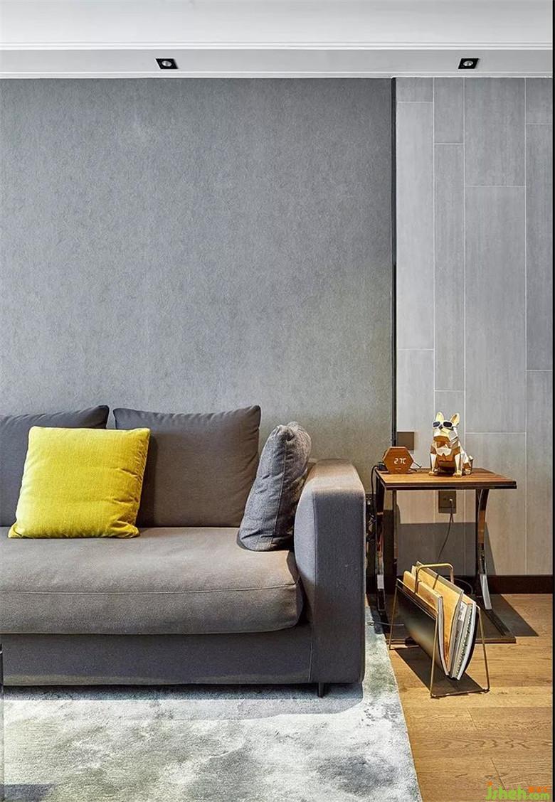 ▲灰色的布藝沙發(fā)和壁紙,使得客廳整體的色調(diào)更加和諧呼應(yīng)。原木色的地板、明黃色的沙發(fā)靠墊、以及邊桌上金色的裝飾擺件,都為這一空間增加了亮點(diǎn),色彩鮮明得可謂恰到好處。