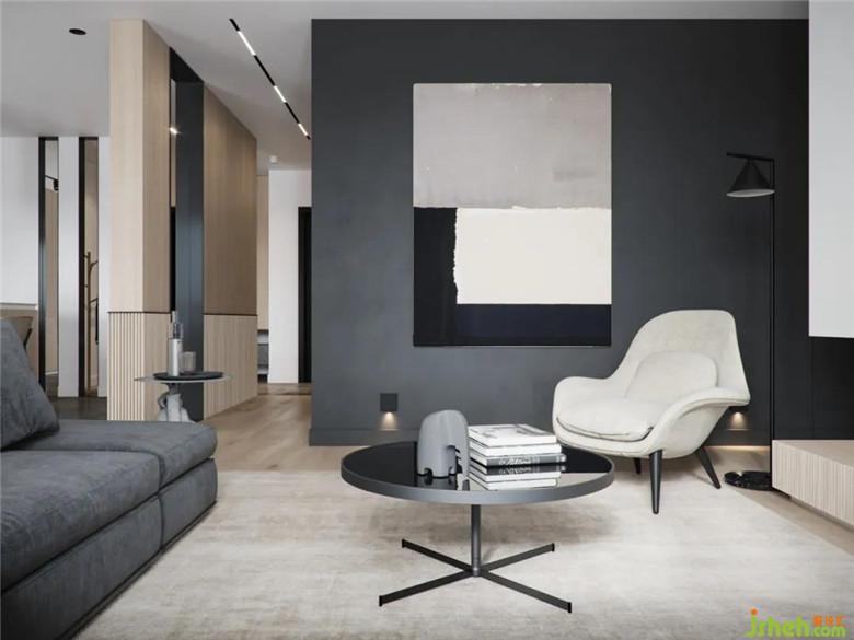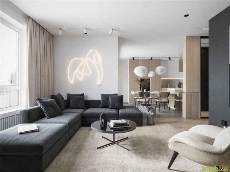 極簡的色塊,灰色布藝沙發(fā),淺咖色地毯,低調(diào)而自然。