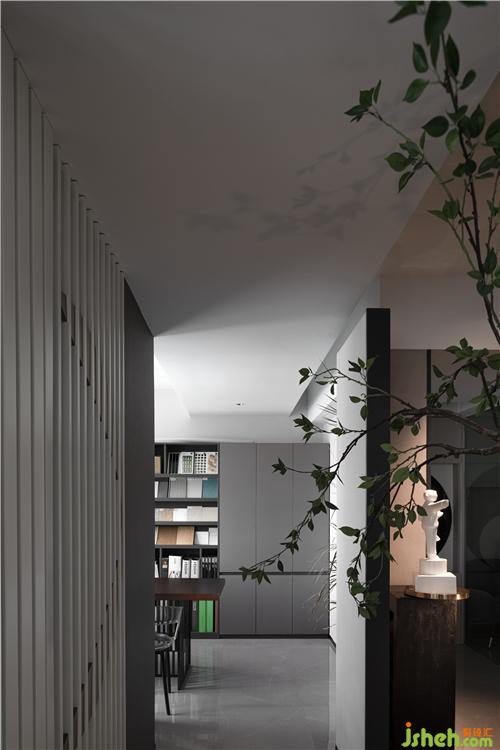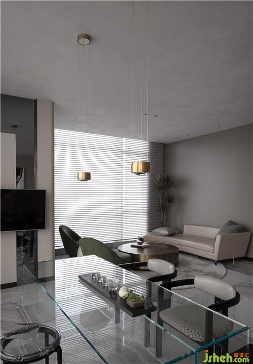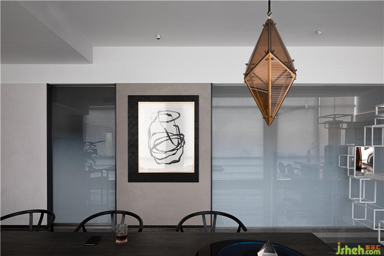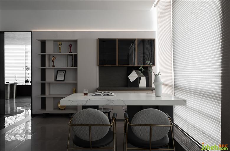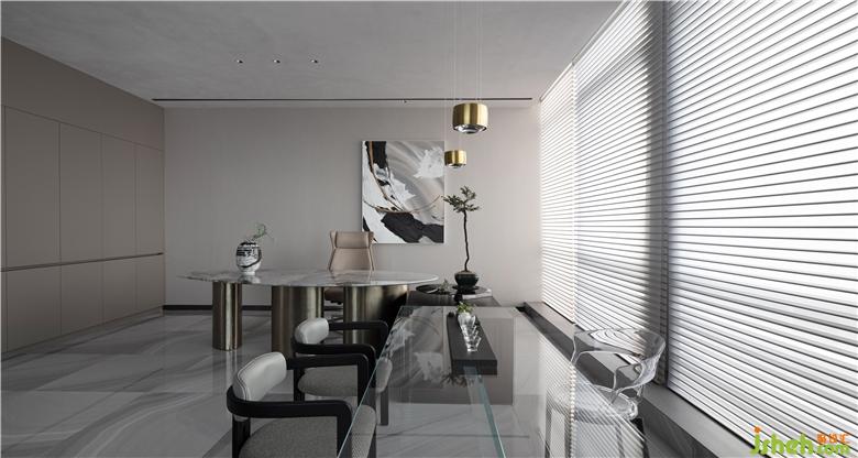 總經(jīng)理辦公室營造的是一個簡約輕奢又帶有淡淡中式文化底蘊的空間,掛畫、大班臺石材臺面、花瓶、地磚等表面波浪紋理形成了一種水墨流淌的氣息,橢圓的大班臺和圓形的茶幾讓空間更為柔和親切,超白玻璃茶臺搭配簡約的原石茶具,還有造型精致的德國原裝進口OCCHIO小吊燈,讓整個空間顯得干凈而且統(tǒng)一,隨著百葉狀香格里窗簾除除升起,窗外開闊的景觀躍然眼前,置身其中,有一種忘卻浮世繁華的寧靜。