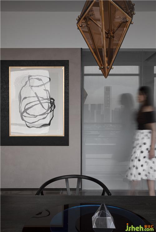 辦公區(qū)與共享空間之間是一面絲印漸變玻璃,讓辦公區(qū)既能享受戶外的景色與陽光,同時又具備一定的私密性,還避免了東向早上強烈的陽光照射。會議桌上寶石形狀的吊燈又如金色水滴,下方的三色圓形亞克力組合裝置彷如水滴泛起的漣漪,在燈下形成光影交錯,辦公室設計帶動了空間的靈性。