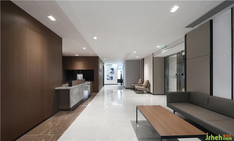 前臺(tái)背景墻以白色墻身磚鋪設(shè),銀灰?guī)r石材作為前臺(tái)臺(tái)面,沉穩(wěn)莊重。木色與與巖板搭配,辦公室設(shè)計(jì)以簡(jiǎn)單的解構(gòu)手法表現(xiàn)出干凈利落的辦公氛圍。