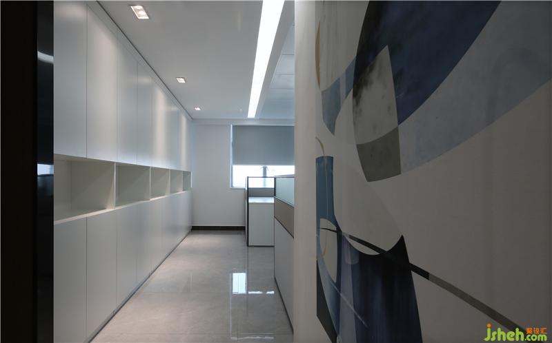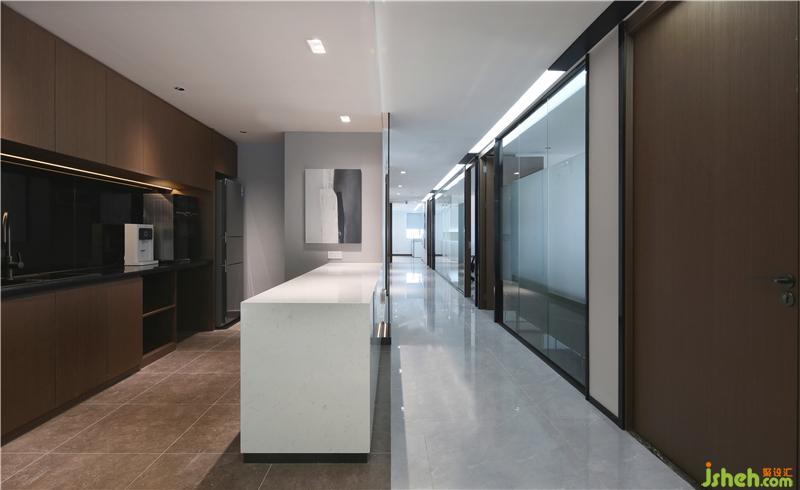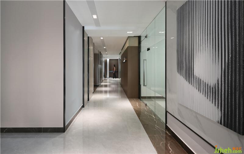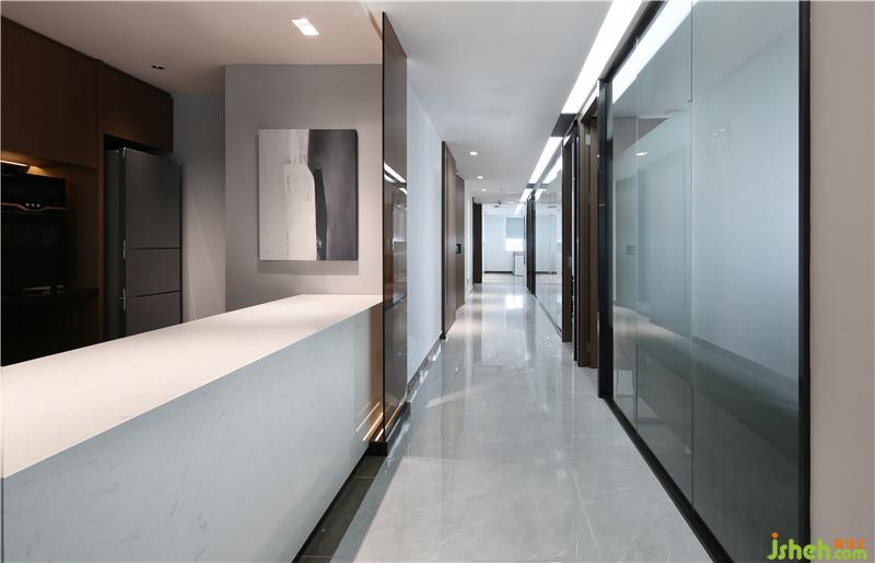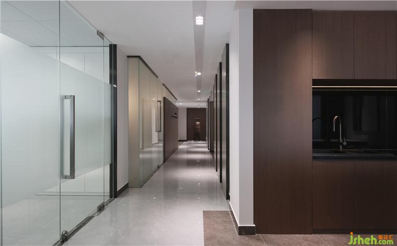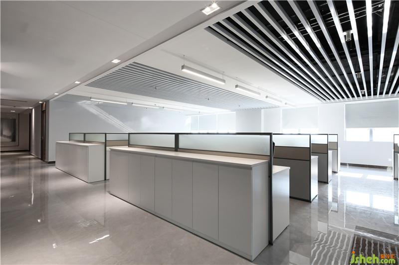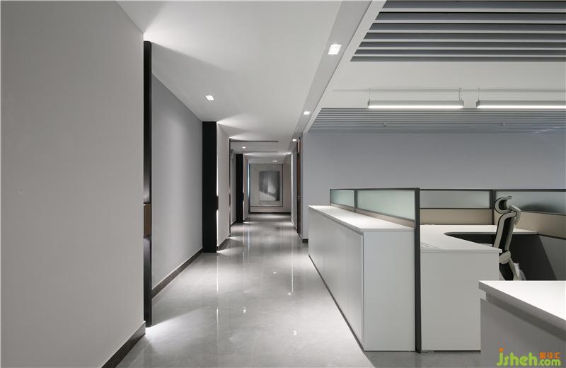 把開(kāi)放式辦公區(qū)融入走廊中,擴(kuò)大了視覺(jué)延伸。而辦公區(qū)域過(guò)道在色調(diào)上融為一體,讓辦公空間更顯寬敞。
