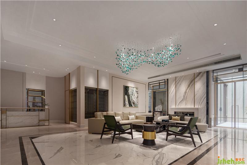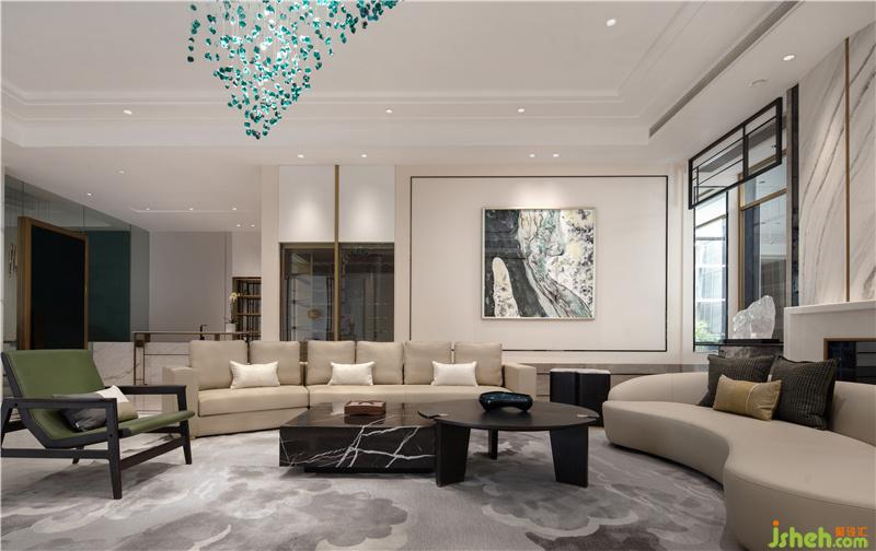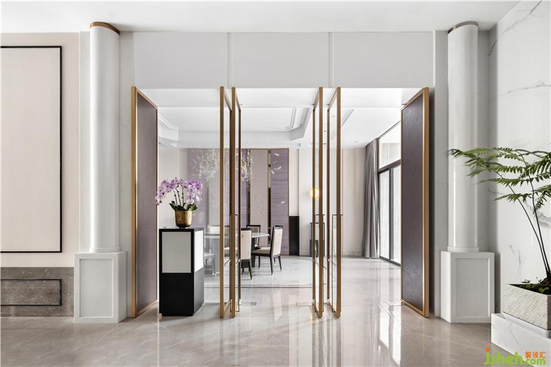 在會客廳的設(shè)計中,設(shè)計師運用了中式與歐式相結(jié)合的設(shè)計元素,以現(xiàn)代簡化的手法呈現(xiàn)于空間中。如沙發(fā)后的背景墻取意了古時大宅壓背的傳統(tǒng)屏風(fēng)造型,簡化為薄板石材元素,簡約而大氣。墻身的方形線框同樣為中西框線符號簡化而來,并與墻身的造型墻裙形成了呼應(yīng),精致而不失奢華。
