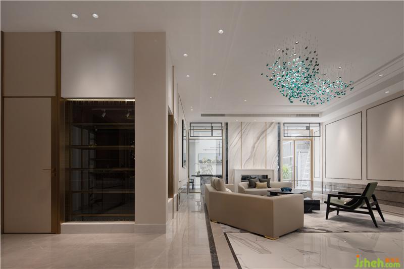 而進入餐廳門洞側(cè)的圓柱則是取意于歐式羅馬柱,中西文化相融而不違和。而作為接待來客的主要區(qū)域,設(shè)計師在會客廳旁設(shè)置了酒窖與吧臺,并以玻璃隔墻作為酒窖的部分墻身,使排列有致的酒架兼具展示作用。