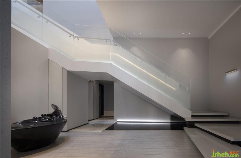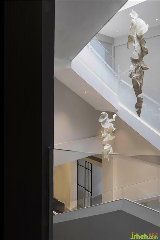 梯底暗喻水面的黑色玻璃地面,更襯托出梯級的立體感,中空手工紙?jiān)拿耖g藝術(shù)裝置,如朵朵浮云,飄于空間之上,呼應(yīng)著陽光盡頭魚躍江面的黑色藝術(shù)裝置,讓水與云的元素隨陽光無縫融入空間。拾級而上,心情也隨之闊然開朗!佛山會(huì)所設(shè)計(jì)
