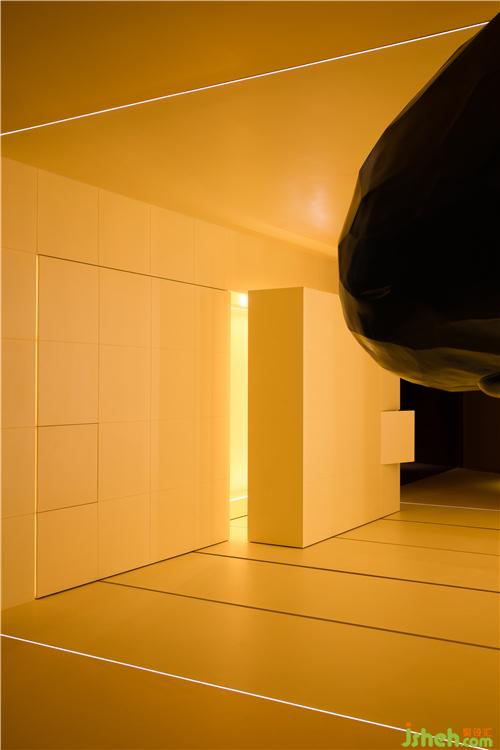 在平滑墻面的另一側(cè),隱藏著六個推拉展示柜和分享會使用的凳子,展現(xiàn)了強(qiáng)大的收納和展示功能。凳子融合了產(chǎn)品、功能、美學(xué)藝術(shù)為一體的產(chǎn)物,看上去就像以直覺和想象力水到渠成的抽象派藝術(shù),是這個空間不可或缺的移動元素。