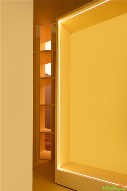 一切回歸于簡潔,讓位于空間中最實質(zhì)內(nèi)容的凸顯。源自巧克力的方格展示柜首奪眼球,四周運(yùn)用了可調(diào)燈光,勾勒了展示柜的形狀,迅速讓產(chǎn)品成為焦點。裝修設(shè)計