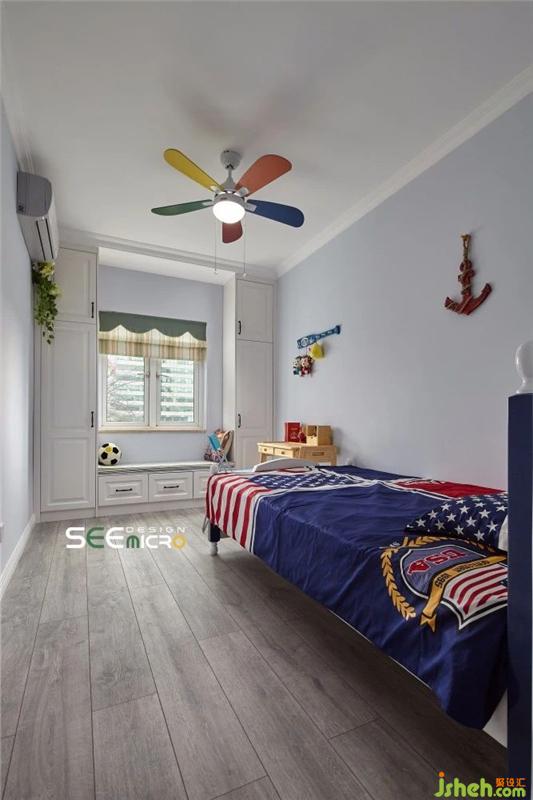 墻壁粉刷成淡藍色,素凈卻又不失童趣。整個空間的美式風格集中體現(xiàn)在兒童床、床品與墻飾上,海軍藍與落日紅碰撞出鮮明的風格特點。窗兩邊定制了衣柜,中間特意增加了一個飄窗卡座,滿足儲物功能的同時,又打造了孩子的另一個玩耍區(qū)。