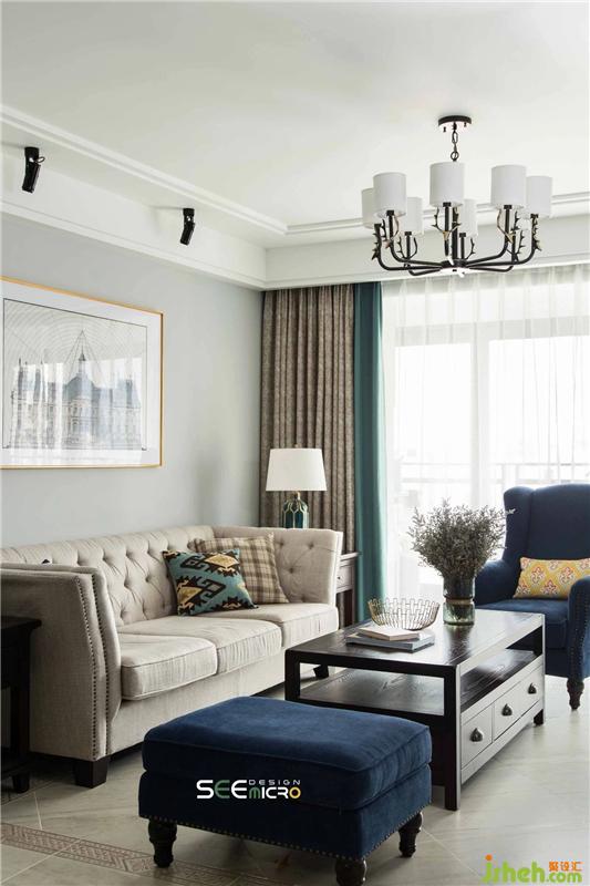 客廳的整體顏色,是通過藏藍(lán)色沙發(fā)和鐵藝質(zhì)感的裝飾來(lái)打破空間的沉悶感。整體氛圍比較明亮,清爽,頗具品質(zhì)感。通過一張壁畫豐富了整個(gè)空間的層次感;給家的氛圍增添幾分設(shè)計(jì)感。客廳墻面整體柜增加了美式經(jīng)典的線條感,沙發(fā)輕奢造型感搭配胡桃木色的茶幾,精致又不失單調(diào),通過窗簾、軟裝飾品的呼應(yīng)讓整個(gè)空間突出了質(zhì)感和舒適感。裝修設(shè)計(jì)