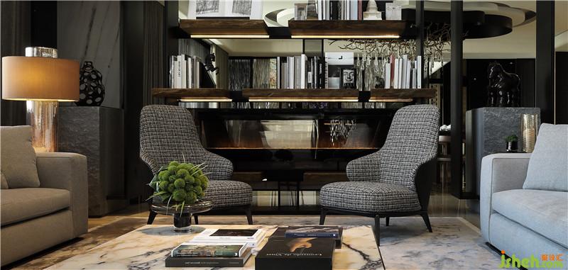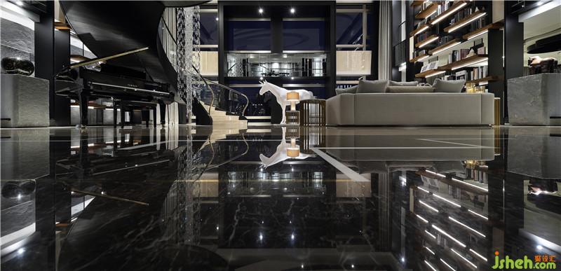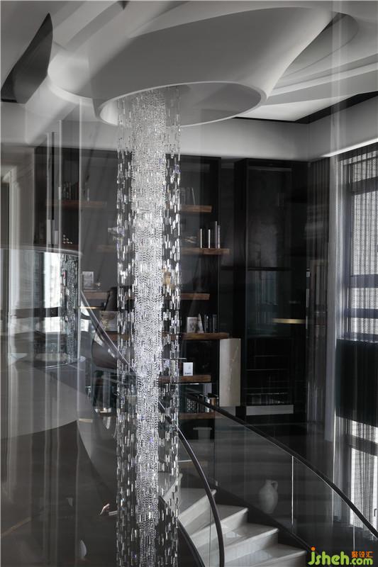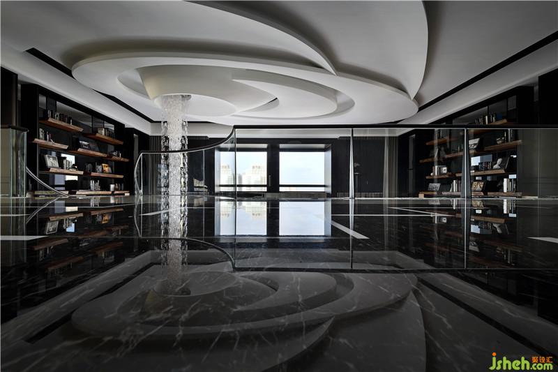 起居室作為整體空間的核心,運(yùn)用挑空的建筑優(yōu)勢(shì),搭配落地窗,創(chuàng)造廣闊的視野。地坪采圓形幾何分割,材質(zhì)精巧,搭配優(yōu)雅的弧形旋轉(zhuǎn)梯,盤繞于6米高的水晶燈由天花板,延續(xù)至整個(gè)空間創(chuàng)造大宅的氣度正式性。左右兩側(cè)高聳的書墻,挑高梁帶利用鏡面分割空間放大與修飾梁帶線條,鐵件搭配實(shí)木,光線安排讓整體書墻更精致。梁帶使用石材及劈面石材互相搭配,凸顯變化與空間肌理。書墻搭配后方預(yù)設(shè)的通道,使視覺層次提高,讓人可靠著俯視,呈現(xiàn)