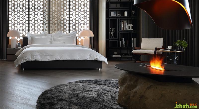 次男房風(fēng)格設(shè)定為現(xiàn)代極簡(jiǎn),格局開放穿透設(shè)有夜間品酒、訪客聚會(huì),客制化吊飾壁爐、等功能,石桌板挖孔崁入水霧型壁爐,搭配弧形沙發(fā)組,感覺就像在夜店與朋友品酒,穿透式雷射切割木板隔屏,串聯(lián)更衣區(qū)及臥室區(qū),完全不