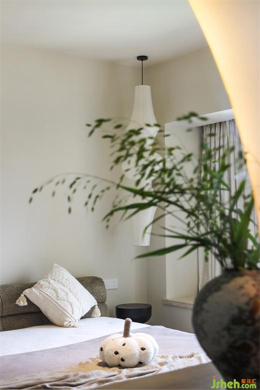 主臥動(dòng)線重組,亞運(yùn)城天峯家裝設(shè)計(jì)以軟裝來(lái)營(yíng)造出整體空間的調(diào)性,溫潤(rùn)的木質(zhì)元素結(jié)合柔軟的布藝,整個(gè)空間都營(yíng)造出松弛靜謐的氛圍感。