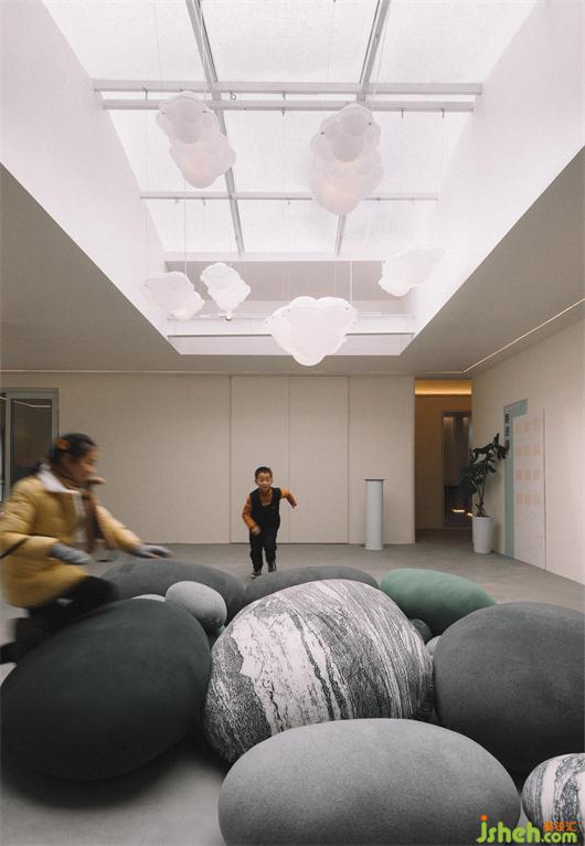 延續(xù)內(nèi)外一致性,活動(dòng)室入口中庭頂部采用陽光板以呼應(yīng)建筑外部,產(chǎn)生曖昧關(guān)系。四周被分解的空間單元通過中庭軸線再次統(tǒng)一起來,加固的結(jié)構(gòu)支撐方式則將地面釋放與使用者。