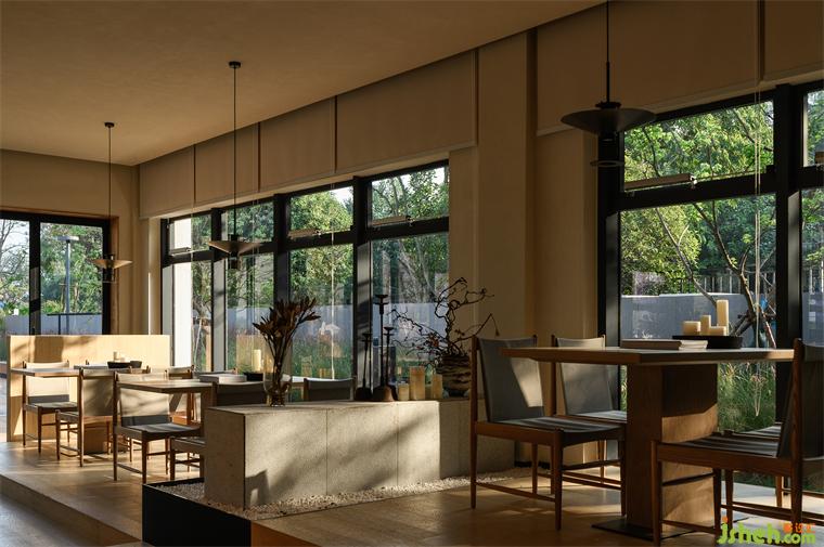 在舒適與開闊的體驗(yàn)之外,我們也希望為空間內(nèi)保留一絲粗糙特質(zhì),餐廳設(shè)計(jì)以增加空間的可讀性——因此在材料的選擇上,立面裸露的原石肌理與粗獷的原木木紋相映成趣,搭配肌理漆與復(fù)古手工做舊質(zhì)地的金屬點(diǎn)綴其中,讓整體室內(nèi)風(fēng)格質(zhì)樸的好似被時(shí)光沉淀過的文化韻味,以反精致的松弛感,與周遭的自然野趣環(huán)境也能夠和諧互融,讓這里成為一個(gè)社區(qū)業(yè)主、酒店住客、營地游客都可以無負(fù)擔(dān)進(jìn)入的場所。