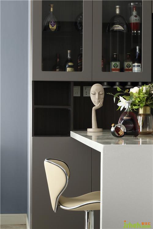 吧臺(tái)處大理石臺(tái)面與深灰色裝飾柜的巧妙結(jié)合,在彰顯空間精致感之余,也起到了視覺(jué)延伸的作用;原有的廚房,又增加了一個(gè)“島臺(tái)”,讓餐廚區(qū)形成了一個(gè)可供家人情感互通的整體......