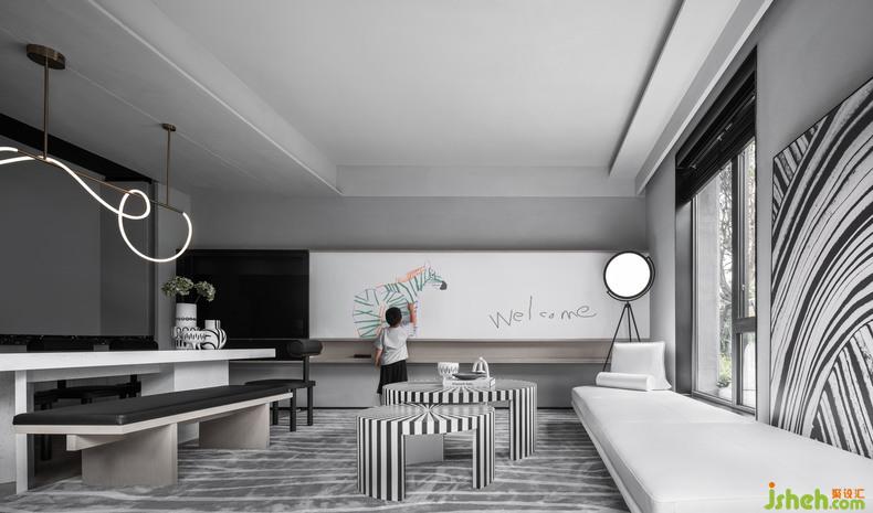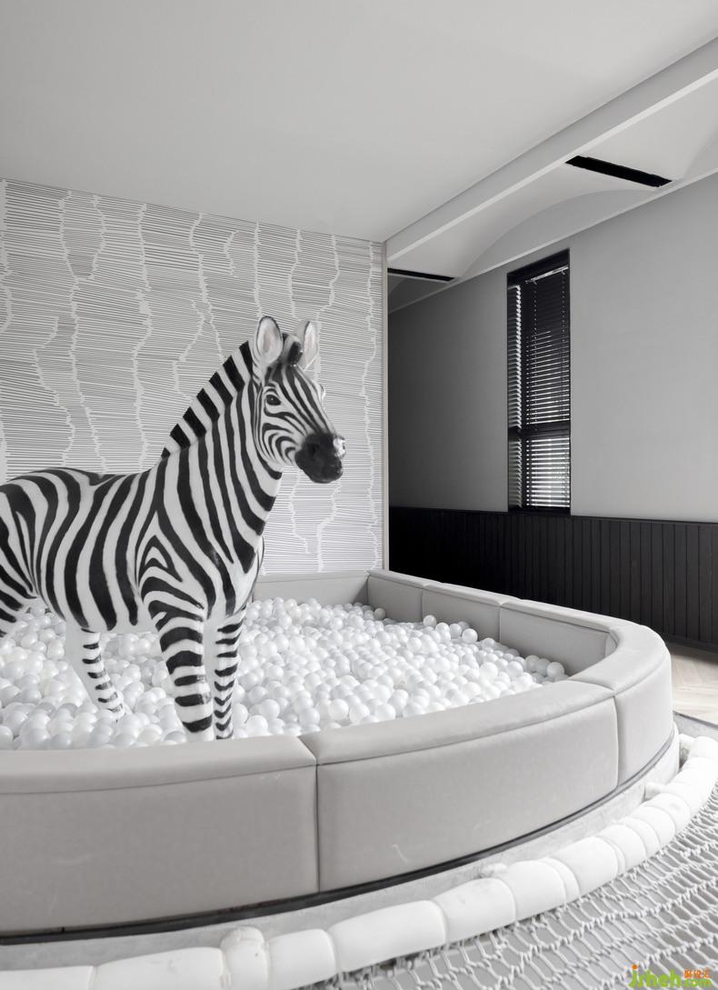 斑馬主題民宿以藝術(shù)的冒險(xiǎn)為主題,斑馬在媒體上一直是時(shí)尚的寵兒,設(shè)計(jì)團(tuán)隊(duì)由斑馬時(shí)尚的條紋中提取靈感,室內(nèi)設(shè)計(jì)師在空間中布置了涂鴉繪畫板,攀爬網(wǎng),泡泡池等親子互動(dòng)空間。特別適合藝術(shù)氛圍的家庭入住,在這里,大人也可以是小孩子,也可以和孩子一起造夢(mèng),兒時(shí)稍在墻面畫了一根線就會(huì)被罵的小孩成為了家長(zhǎng),帶著自己的小孩來到斑馬主題民宿,兩人一起開心地在客廳畫起了屬于他們的故事。線條及塊面的設(shè)計(jì)元素處理,無形中也是對(duì)孩子審美的提升。