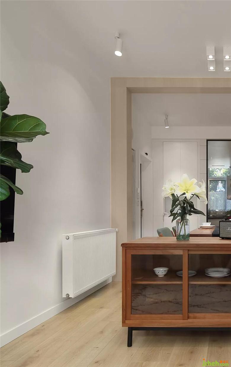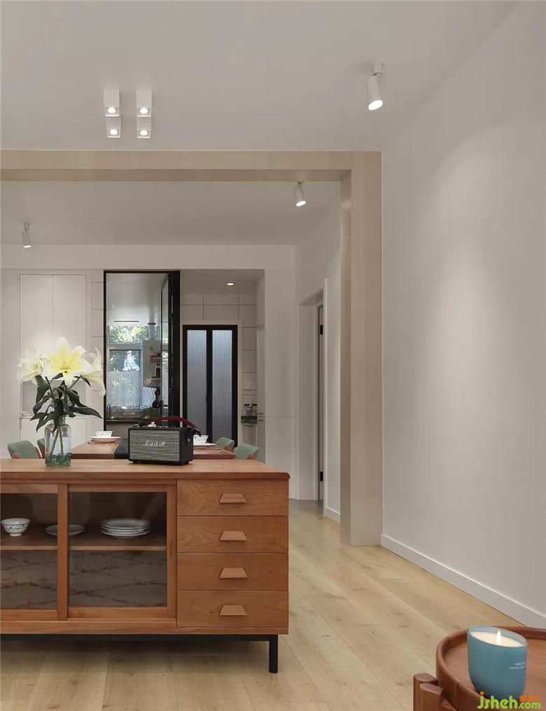 首先格局劃分和業(yè)主溝通后確定只需要兩個臥室加個書房,其次是把衛(wèi)生間做干濕分開,把其中一個臥室門封閉做臺盆柜,次臥和書房做成一個套間,方便孩子學習。最后是廚房門口部分墻體做儲物,另外一邊和衛(wèi)生間共用的墻體打開做成玻璃隔斷和廚房的玻璃門連起來形成通透的視覺,這樣做的效果就是不管是廚房還是衛(wèi)生間干區(qū)體驗感都非常開闊,也把餐客廳的空間感延伸了。