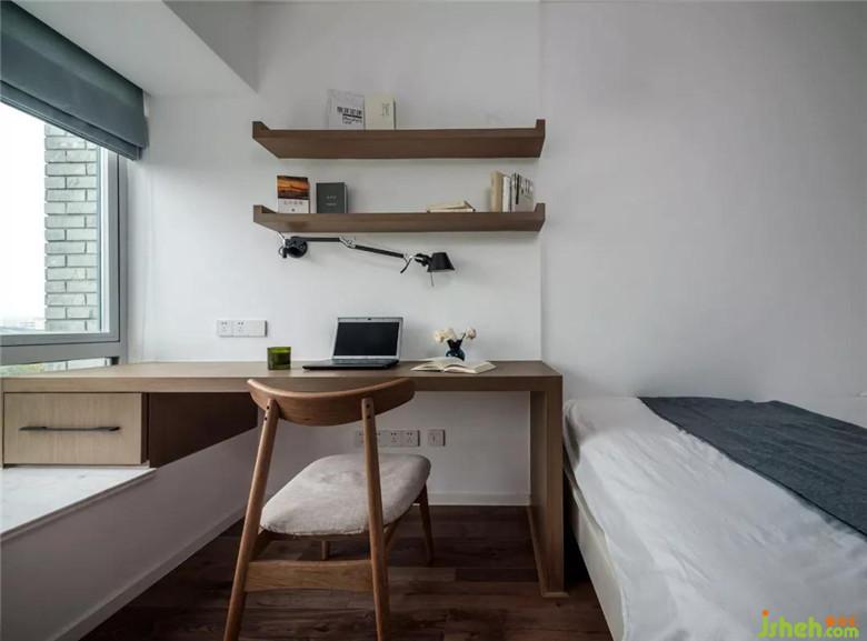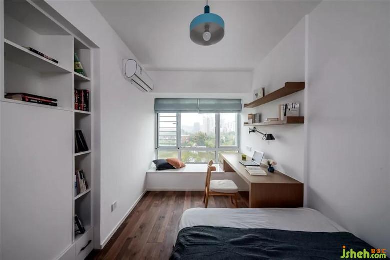 次臥門口的小空間歸到次臥里,然后做了個大的儲物柜,這樣儲物柜的側(cè)面和原來墻體融為整體后作為床頭墻面,靠窗位置做了寫字臺,和客廳公用的墻體拆掉做成了書柜,客廳那一面自然形成了一個突出面掛電視,非常實(shí)用。
