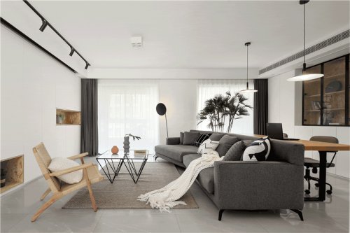 客廳舍棄了傳統(tǒng)電視改成書柜加投影和環(huán)繞音響,針對不同使用需求。書柜下半部分做了開放式用來放置音響設(shè)備及孩子玩具收納。