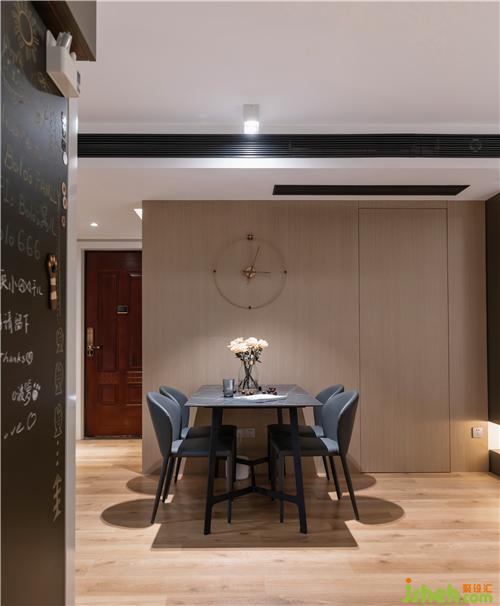 ▲勞倫黑金巖板餐桌,配以灰色真皮餐椅,穩(wěn)重精致。整面的KD板,再內嵌隱形門,保持客廳的整體性和完整度。KD板細膩的紋理,天然成為西班牙鐘的鐘面,不著數(shù)字的表盤,讓人領會時間中的留白南京室內設計師。