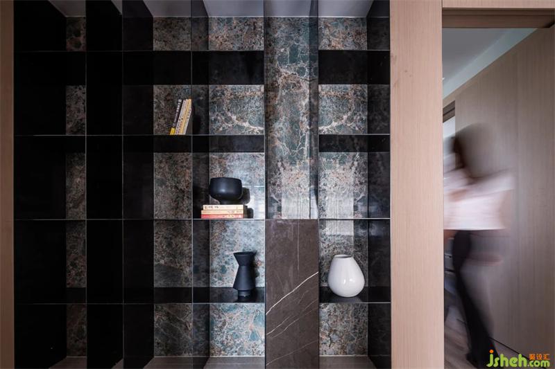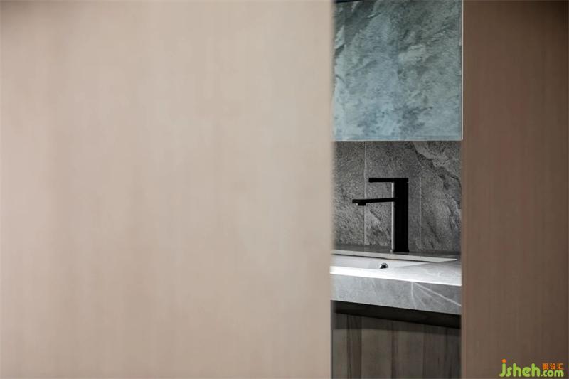 狹長的過道敞開一面鋼板柜,緩和過道的單調(diào),打開了過道寬敞的視覺平衡。軟和硬的結(jié)合豐富材質(zhì)的多樣和平和。