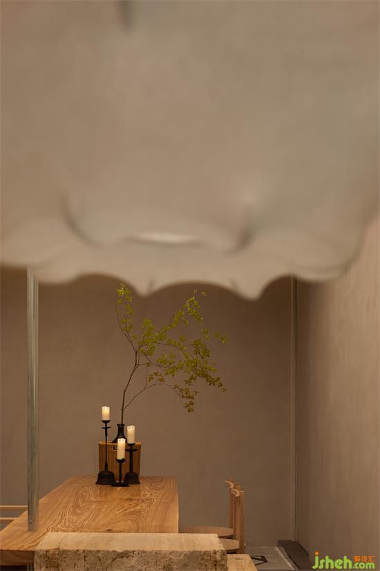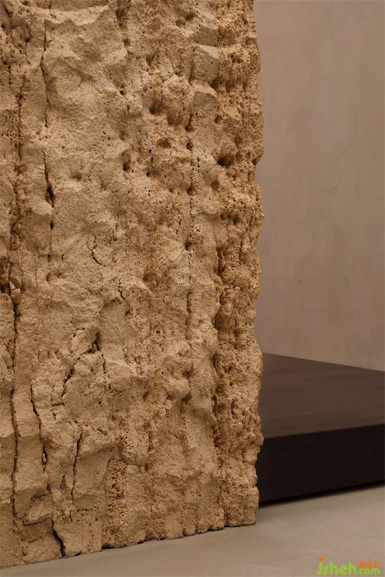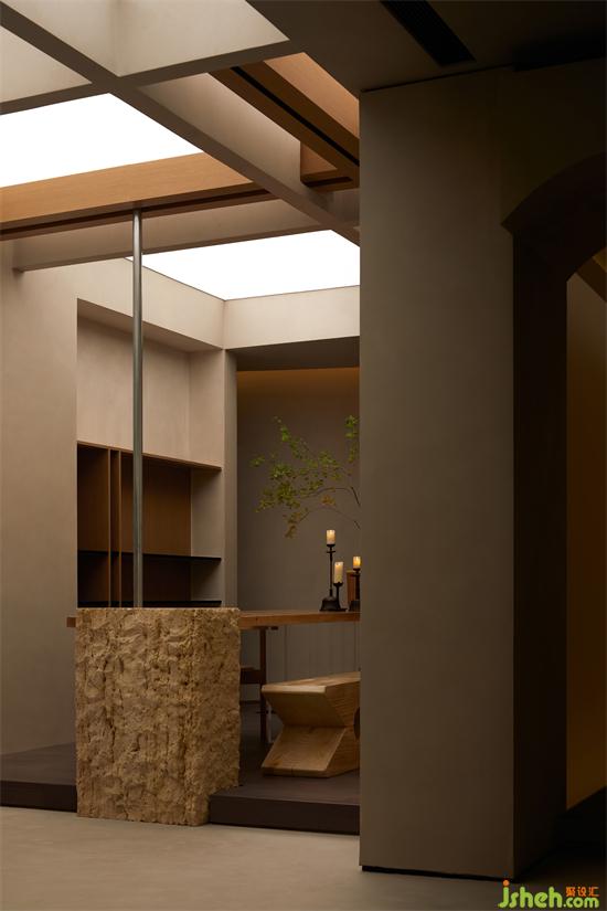 筱原一男將民家土間內部的立柱,剝離其象征男權的主導地位,抽離成“白之家”的纖細裸柱,與其說它表現(xiàn)了某種象征性,不如說是抽離了象征的裸結構。展廳設計作為茶臺的主要力量支撐,經過精心加工的洞石以自然面的姿態(tài)承擔不同界面的銜接和聯(lián)系,一根亮面的小圓柱使天花、茶臺與地面產生連接,表示空間能量的內在流動。