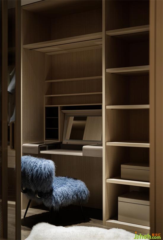 豪華的步入式衣帽間被巧妙地隱藏在一個深色木飾面的體量中,別墅裝飾設(shè)計衣帽間的兩側(cè)設(shè)有滑動門。當(dāng)滑動門關(guān)閉時,衣帽間便是一個封閉的私密的半通透的空間。