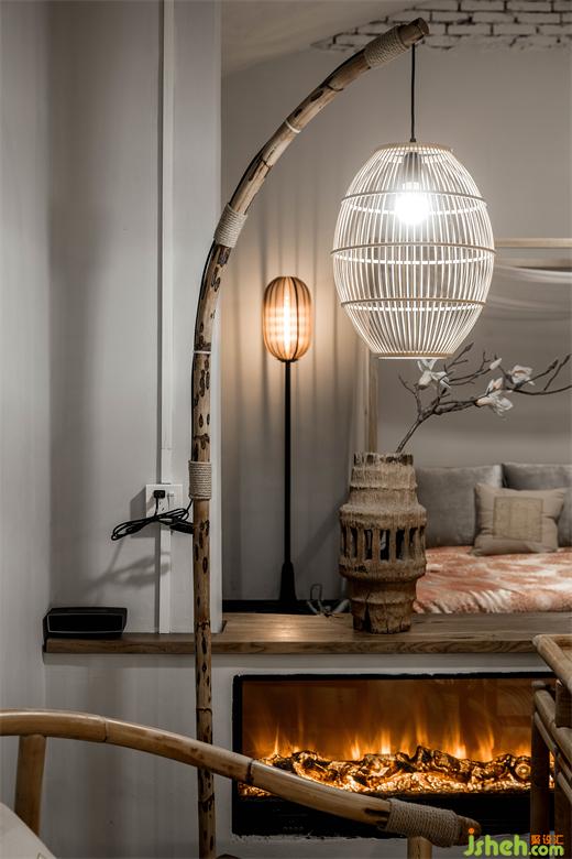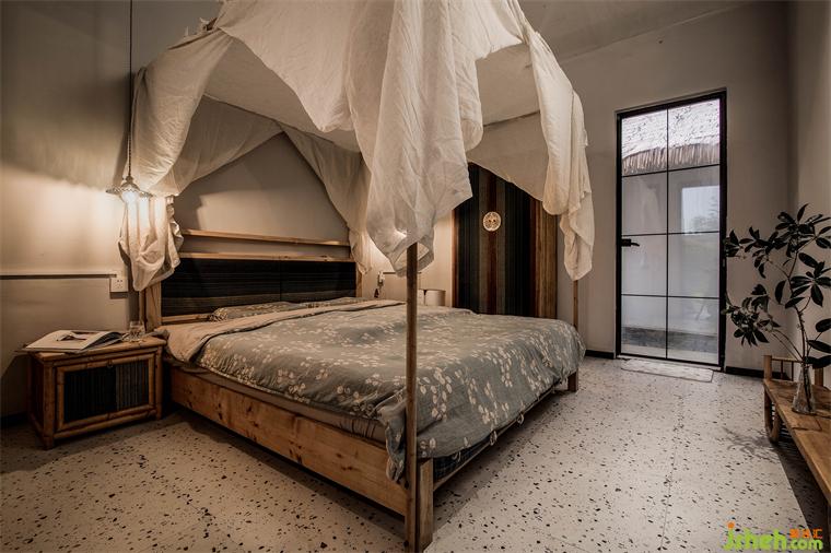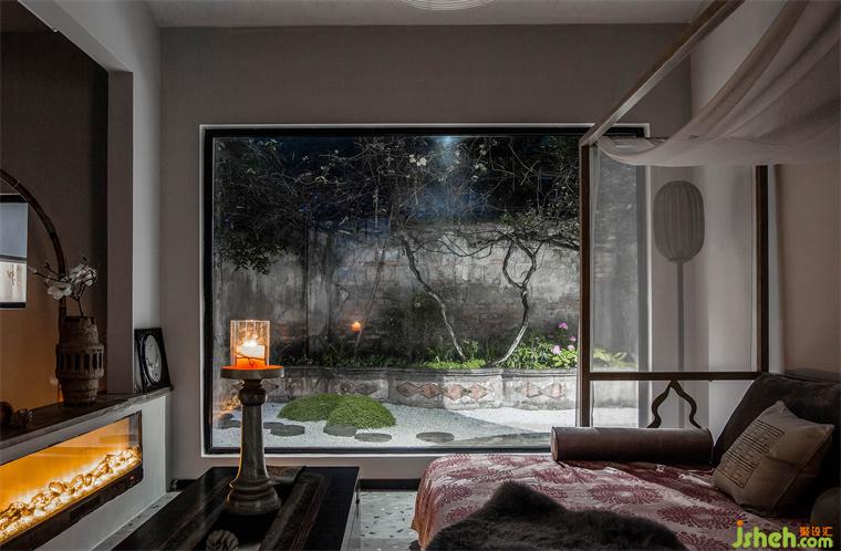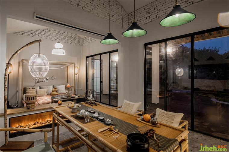 舊房改造設(shè)計(jì)以茶桌前景,以帶紗幔的禪床為遠(yuǎn)景的主客廳布置。