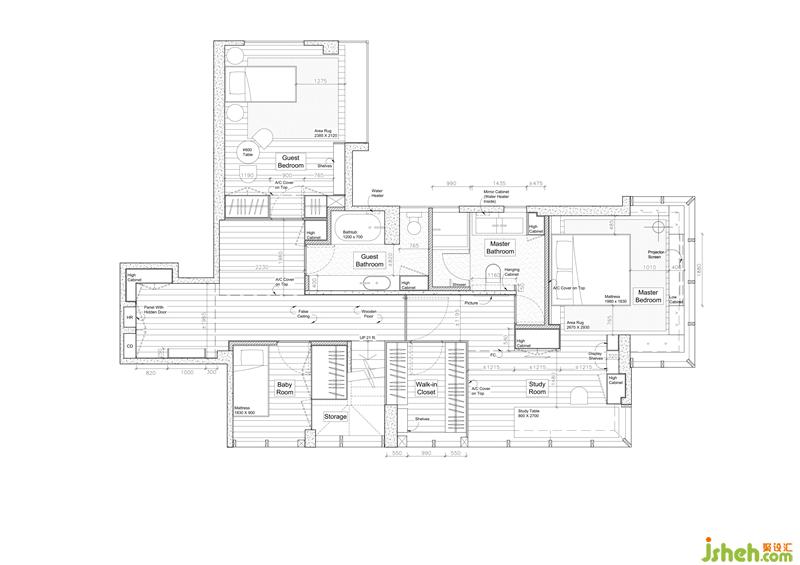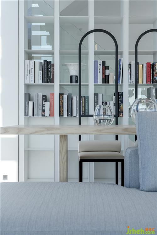 主臥是整個(gè)靜區(qū)的核心,書房型臥室的形制,面積占了整層的近一半。打開主臥門,右手是一個(gè)全明步入式衣帽間,柜門打開你會(huì)發(fā)現(xiàn)收納功能分隔很靈活,結(jié)構(gòu)層次很分明,儲(chǔ)物空間很完整;過衣帽間便是主衛(wèi),依舊是全明帶窗的,雙臺(tái)盆、淋浴間、大浴缸,尺度很舒服,細(xì)節(jié)很到位,該有的都有了;臥房藏在開放式書房的深處,全景的落地玻璃幕墻,外延式的飄窗設(shè)計(jì)給人一種起居、學(xué)習(xí)、辦公都飄在云上的錯(cuò)覺。