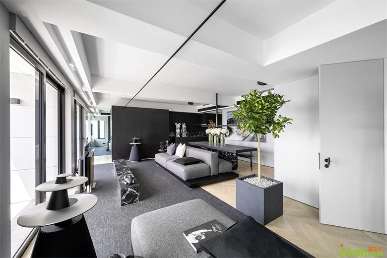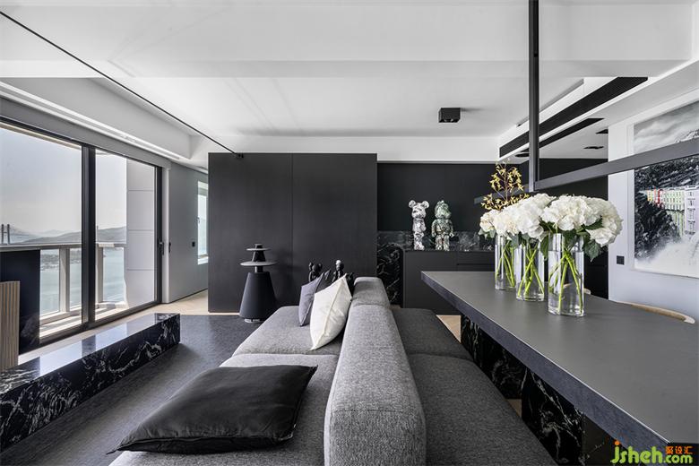 空間主基調(diào)為黑白灰,形成強(qiáng)烈的視覺沖擊,香港私宅設(shè)計(jì)為了平衡黑色的大面積運(yùn)用可能產(chǎn)生的壓抑感與負(fù)面情緒,通過綠色植物與鮮花的細(xì)節(jié)點(diǎn)綴,打破沉悶,生長出自然的呼吸感和治愈的力量。