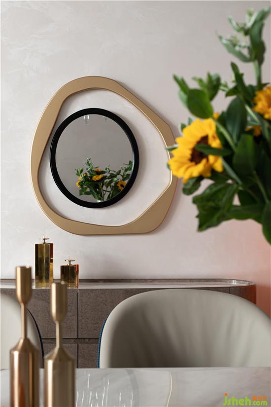 餐廳在延續(xù)空間主調(diào)的前提下,多了一絲純粹的意蘊。精心挑選的橙色冰箱與餐桌上清麗的花葉勾起饗食的欲念,古銅波紋裝飾鏡折射出靜謐和樂的空間氣質(zhì),空間是背景,陳設是前景,而中間則是生活本身,目光所及,春光明媚,生命美好。