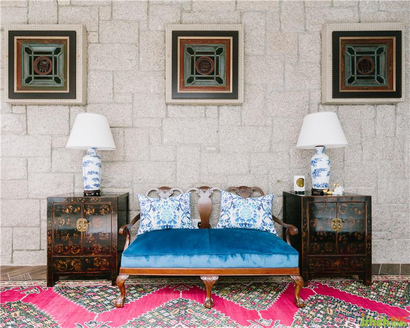 玄關(guān)區(qū)艷麗的波斯地毯,注入這棟老宅空間新的活力,換鞋椅的那抹艷藍(lán)色和地毯的玫紅有了強(qiáng)烈的沖突感,這種沖突感所組成的驚艷,讓并列兩旁描金的古董裝飾柜也有了生機(jī)和活力,青花瓷的臺(tái)燈和抱枕有了輕輕的互應(yīng),中西之美在并不大的玄關(guān)區(qū),有了這么多的內(nèi)容交措,所呈現(xiàn)SCD最善長(zhǎng)的混搭手法;倚在門(mén)廊上的白色鸚鵡,和門(mén)外自然堆起的綠植花藝,滿(mǎn)滿(mǎn)的生活情趣和氣息。設(shè)計(jì)公司