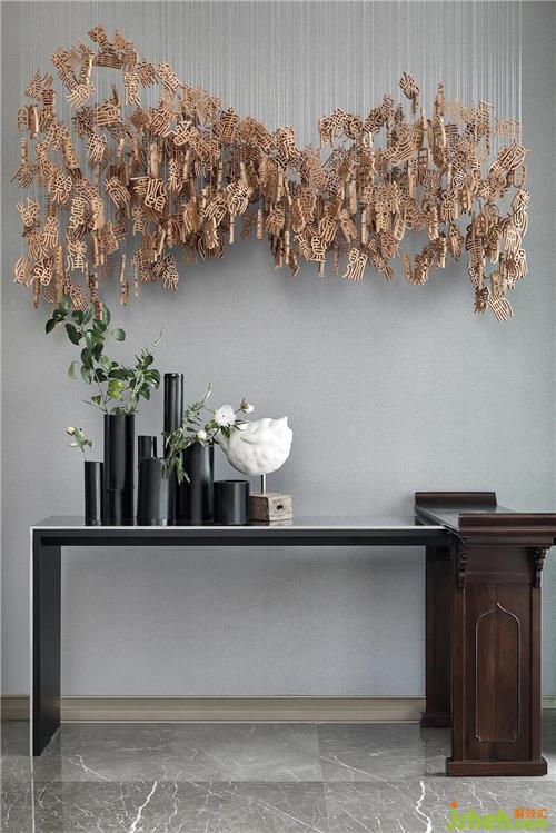 Yunzhan Yunshu, free. The freedom of the cloud is precisely because it has no "self", no normal form, constant in itself. The state of the clouds, as I wish. With carbonized bamboo vases scattered on high and low, insert three or two branches and leaves with flowers, and with hanging decorations of ancient Chinese characters, take the meaning of "bamboo leaves when the wind comes, bamboo leaves no sound when the wind goes". Do as you please, do as you please. Works of art do not stay there quietly, but lead us to feel the atmosphere of life. Space is the boundless invisible, as a designer, may never be able to capture, can not define, because just like the boat in the ferries, even if no one exists, but also can forget the things I lie freely, heaven and earth leisurely.