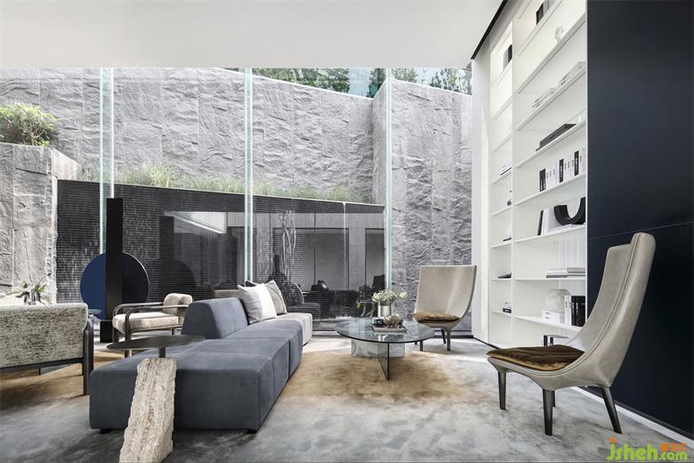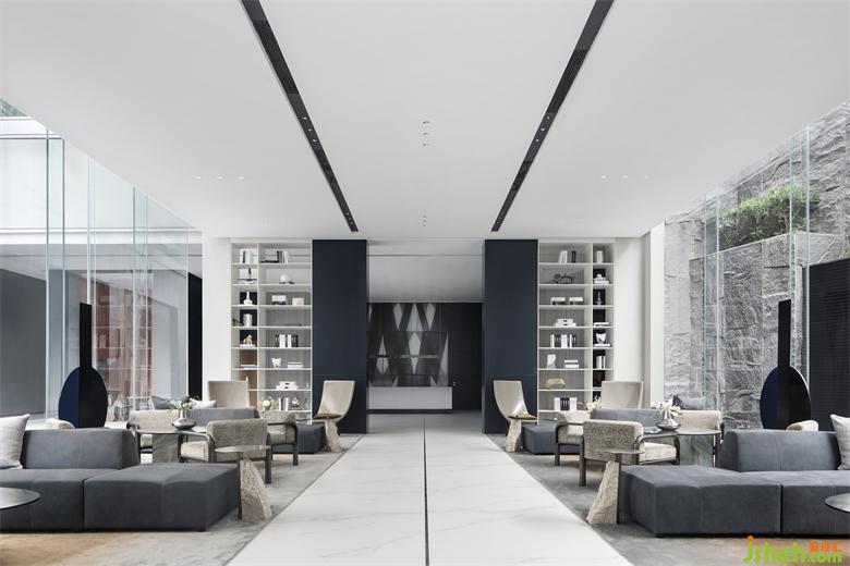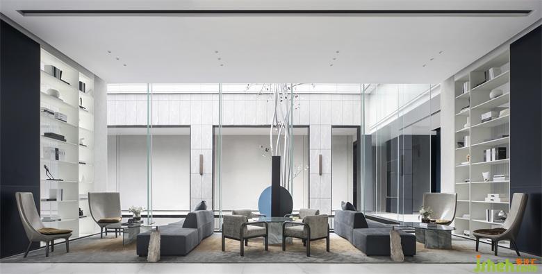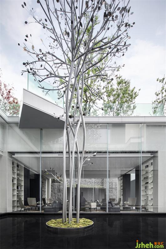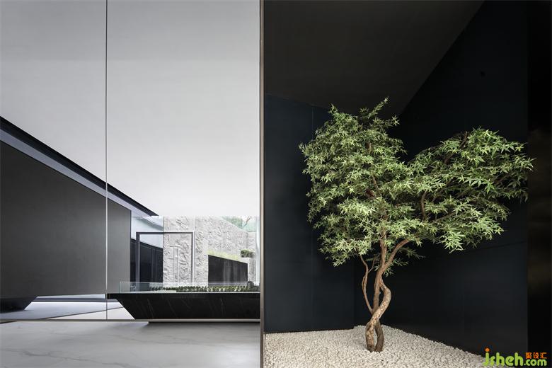 洽談區(qū)簡潔界面與和諧比例共同營造出的柔性向度,隔離了外界喧囂,使觀者逐漸平靜下來。序列、對稱、圍合、收放、虛實(shí)、造就空間層次。陽光的引入,斑駁交織的光影隨著時間的推移,在地面、墻面勾勒不同的形色。