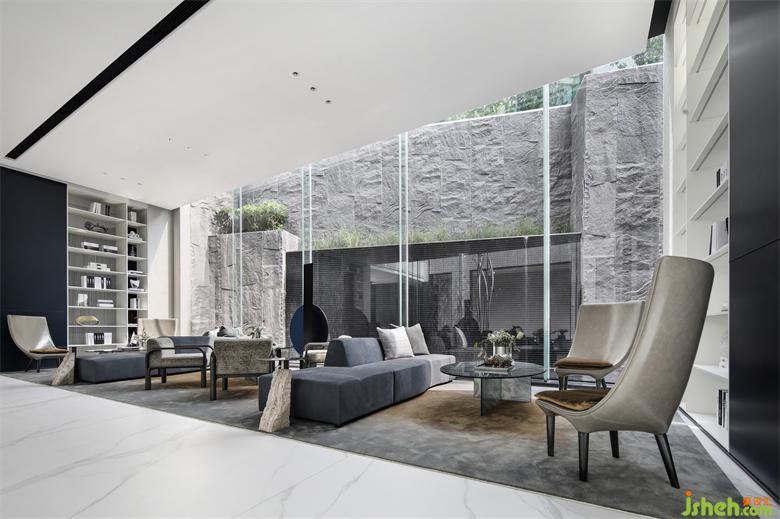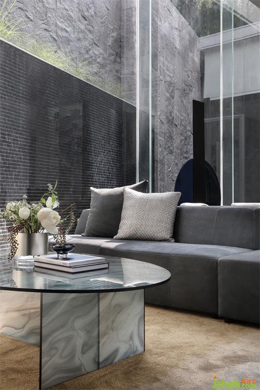 家具的細(xì)節(jié)石雕,互應(yīng)了景觀的山水造景。王安石曰“‘波’乃水之皮”,以水之皮造波瀾,堅(jiān)如石,柔如波,質(zhì)地與形態(tài)的碰撞是交融。這樣的一個(gè)洽談茶幾,亦玩味出了中國(guó)文人心中的水墨山水?!吧綏入[”這種寫(xiě)意的表達(dá)手法,也讓人頓悟設(shè)計(jì)不僅是樣式、造型、材料這些維度。它更是人心中對(duì)于山水、自然和理想生活的寫(xiě)照,打破了設(shè)計(jì)的冰冷與傲慢,變得詩(shī)意且溫暖。