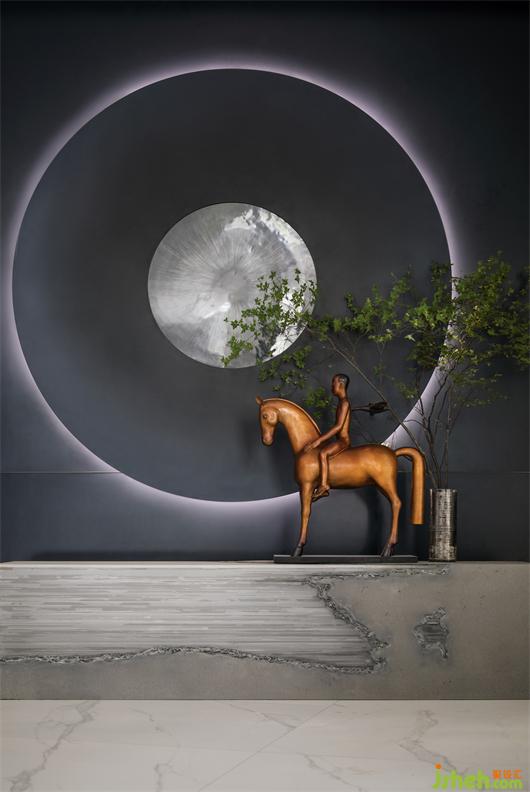 圓象征著完美,中心以瞳孔代表自省,圓的哲學(xué)定義就是開端即末尾,無論從何處開始一定要終點(diǎn)走向起點(diǎn),就像我們都不完美,所以完美是一種信仰,因?yàn)樾叛?,一直在趨向完美的路上自省;這是杜恒創(chuàng)作《瞳孔》的初心。配合藝術(shù)家張勇的雕塑《任逍遙》,營造出“獨(dú)坐幽篁里,彈琴復(fù)長嘯。深林人不知,明月來相照”的詩意氛圍。