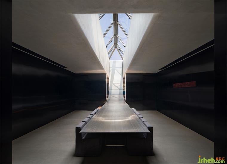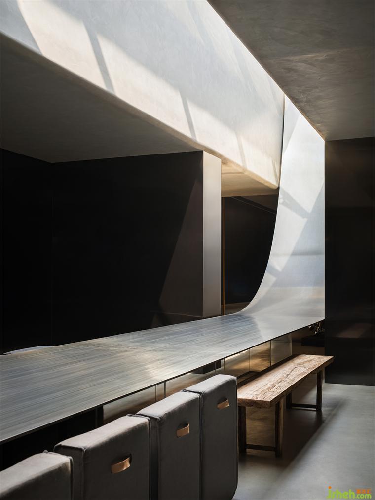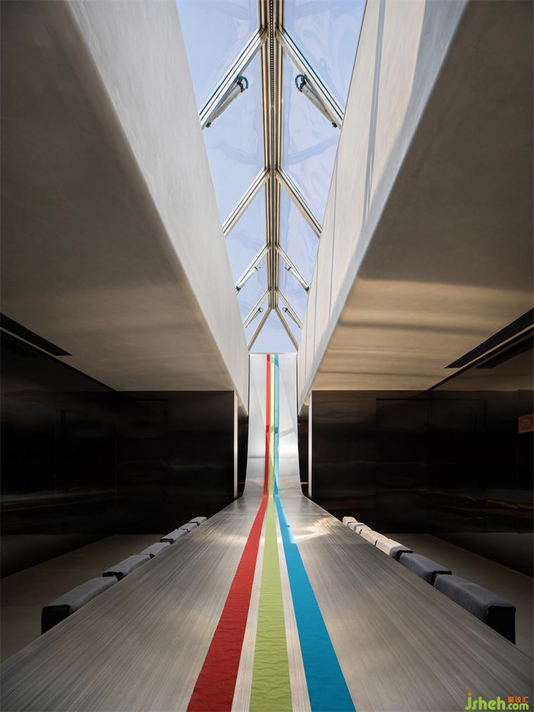 咬定青山,立根巖中。無(wú)畏無(wú)懼,勇攀高峰。中山展廳設(shè)計(jì)企業(yè)向上的路,用果敢鋪就。近15m長(zhǎng),1.2mm厚的灰色不銹鋼板無(wú)縫處理從天而降。登頂?shù)恼鞒蹋脽o(wú)畏的心回應(yīng)。