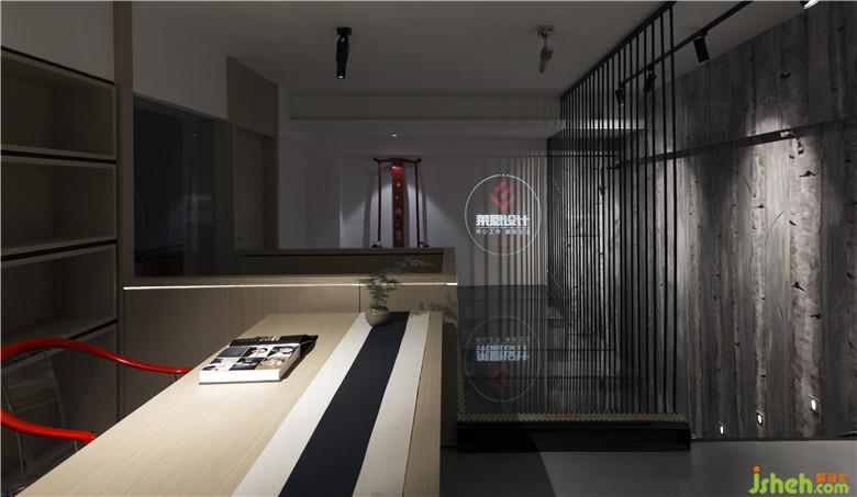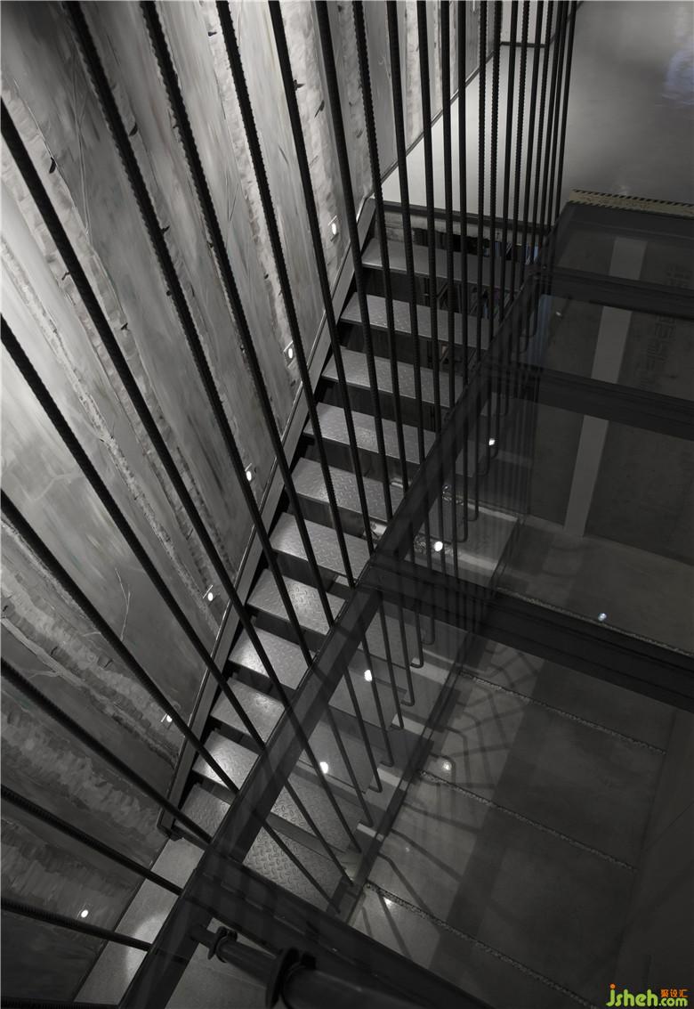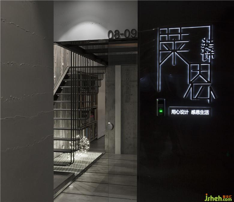 入戶門隨機的白色膩子底像一層層的波浪,同時與入戶玄關(guān)的白色燈帶和景觀沙池形成呼應(yīng),辦公室設(shè)計的黑鈦門框及LOGO背板又和工業(yè)風的黑色不銹鋼樓梯、玻璃棧道、以及玄關(guān)的建筑原墻和地面的灰色麻面大理石磚形成一個整體。