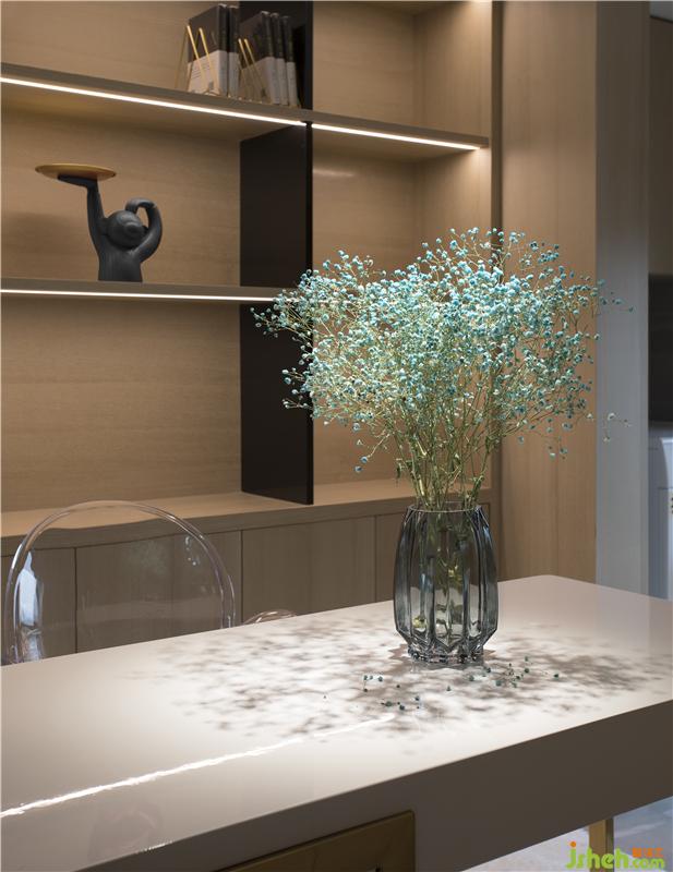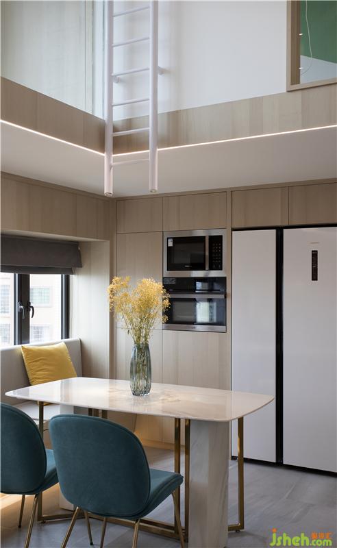 餐廳就餐時(shí),特別訂制的樓梯裝飾射燈光線照在花束上,不僅烘托出溫暖的氣氛,更是勾起熱愛(ài)旅游的業(yè)主無(wú)限美好回憶:一線天、陡峭的上山臺(tái)階… 嵌入式的蒸烤箱可以解鎖更多的美食誘惑,冰箱也是男業(yè)主精心挑選的,超薄極窄可以做到無(wú)縫對(duì)接餐邊柜。