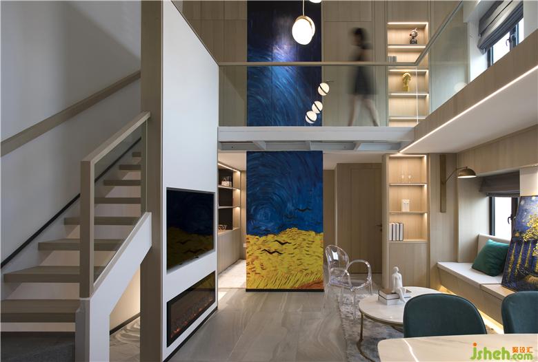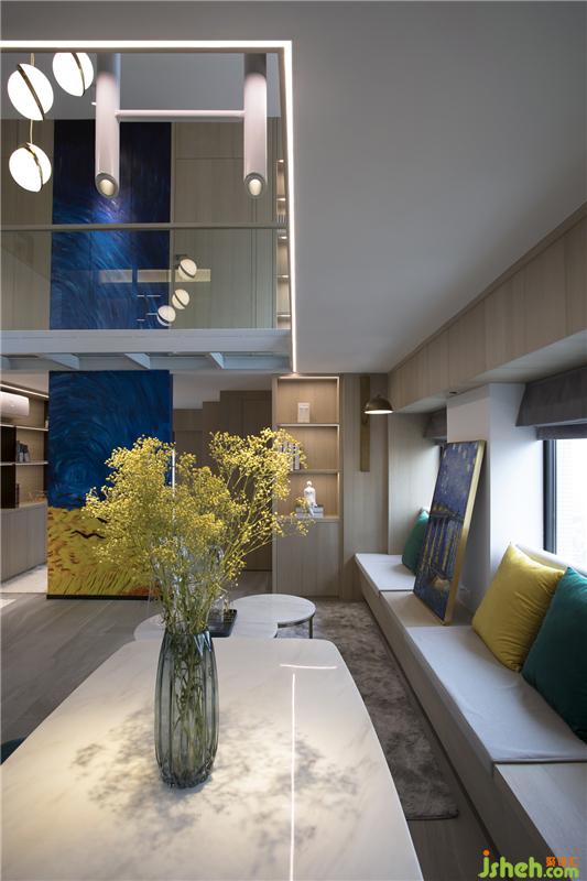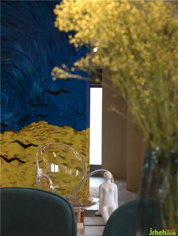 客廳大面積挑空和玻璃棧道的應(yīng)用起到了拓寬了視覺(jué)維度,裝修設(shè)計(jì)讓空間顯得更加流動(dòng)開(kāi)放及富有層次,通頂?shù)难b飾畫(huà)取材自凡高的畫(huà)作,充滿激情的金色筆觸仿佛就像餐桌上的花束,藍(lán)色的星空下一個(gè)人一本書(shū)讓空間充滿了無(wú)盡的遐想……