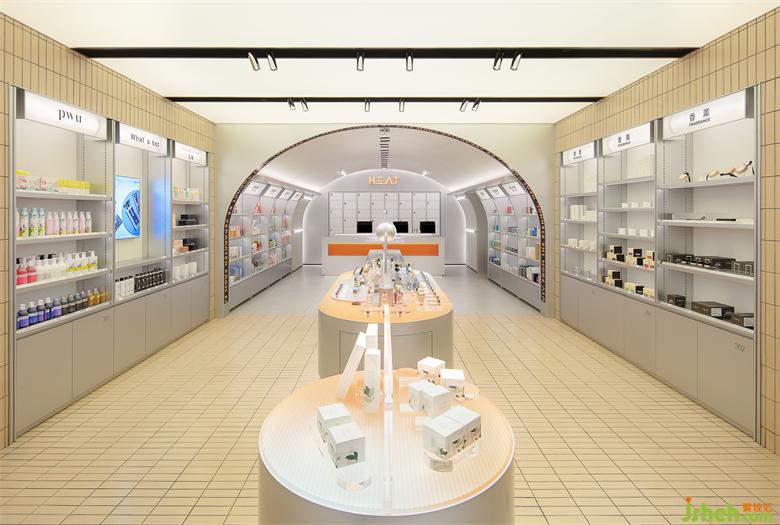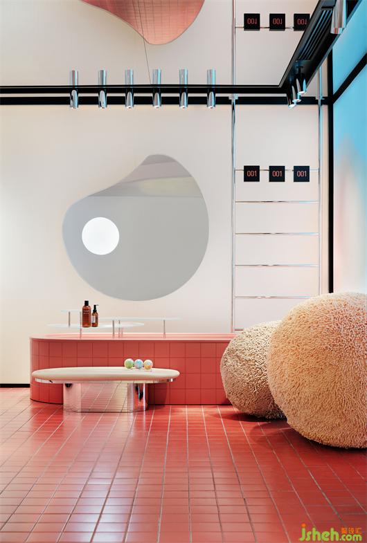 原先隱蔽的拐角區(qū)域被改造為主題體驗(yàn)區(qū),根據(jù)喜燃的選品策略定期進(jìn)行主題區(qū)域設(shè)計(jì)。目前該區(qū)域作為浴室主題區(qū),體驗(yàn)店設(shè)計(jì)使用復(fù)古紅色防滑地磚、大浴球、浴缸和花灑等一系列道具,模擬浴室環(huán)境。浴室主題區(qū)同時(shí)也是店內(nèi)最大的商業(yè)綠洲點(diǎn),可以讓逛累了的顧客在此稍作休息。