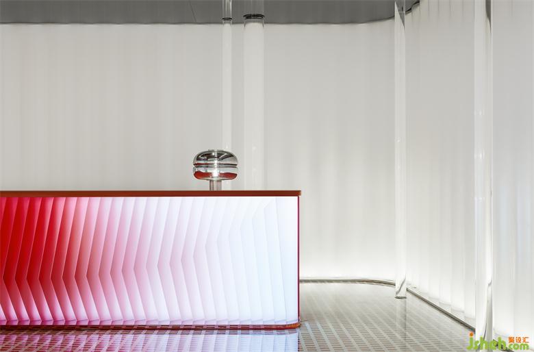 為了更貼合燕窩的獨(dú)特肌理,立品前期對(duì)不同材料的顏色和透光性進(jìn)行研究。材與質(zhì)之間,我們更注重“質(zhì)”的表達(dá),光的引入,增加了材質(zhì)的溫潤(rùn)質(zhì)感,模擬燕窩給人的直觀感受。即便在施工現(xiàn)場(chǎng),我們?nèi)匀环磸?fù)試驗(yàn),對(duì)比不同材質(zhì),找到最接近“白里透紅”的顏色變奏。