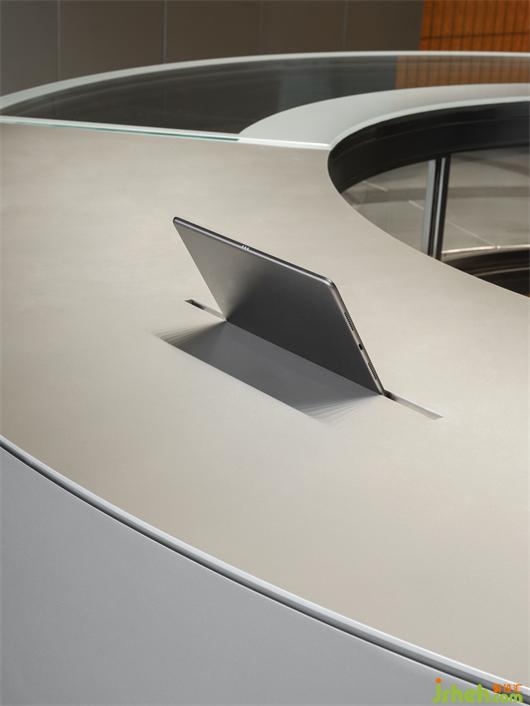 △環(huán)形的點(diǎn)單臺(tái)被大面積的黃砂巖組成的方形墻面包裹,兩種形態(tài)和材質(zhì)的碰撞營(yíng)造出靈感記憶點(diǎn)。