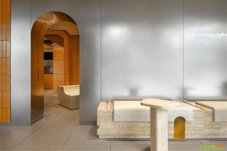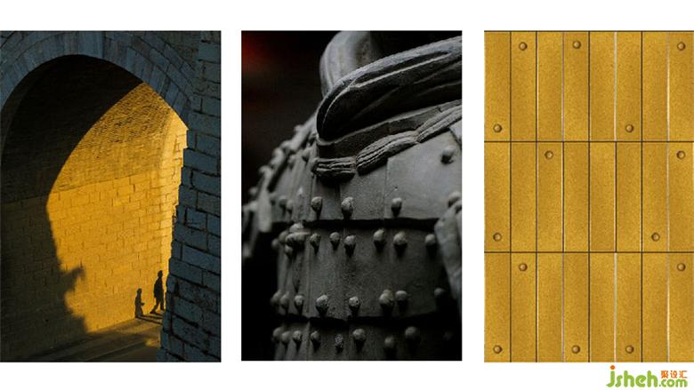 具有標(biāo)志性意義的拱門被金屬材質(zhì)包裹,宛如一道時(shí)空之門。喜茶設(shè)計(jì)穿過這道拱門進(jìn)入內(nèi)里空間,定制的黃色手工磚上,倒模形成的圓點(diǎn)凸起對(duì)應(yīng)著秦俑士官盔甲特有的鱗片圓點(diǎn),那些模糊的歷史文化印記再次浮現(xiàn)。