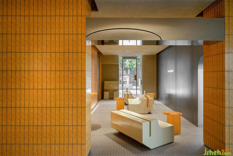在金屬隔斷墻前,是一組不規(guī)則形狀的家具,半透明泛著黃光的樹脂搭配風化感的洞石,座椅面料上的圖案是來自于絲綢之路畫卷中的編織圖騰及元素,內(nèi)里空間散落擺放的不規(guī)則石椅,均呼應了西安這座城市的粗曠和底蘊。