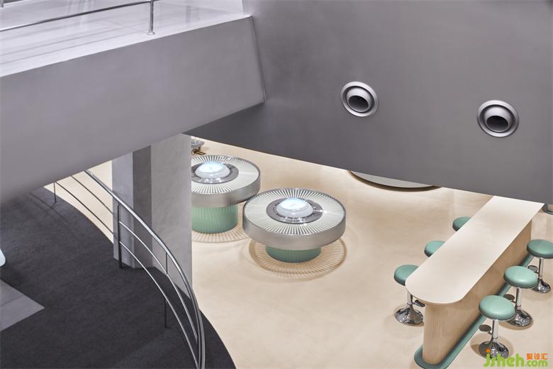 二層空間對應(yīng)故事腳本中的飛船本體,立品將這個空間設(shè)定為bosie實施重返星球計劃的重要實驗基地,將實驗室的場景與業(yè)態(tài)有機結(jié)合。圍繞中空區(qū)域,二層天花設(shè)置環(huán)形燈帶,模擬飛船內(nèi)部的科技感并引導(dǎo)探險者環(huán)繞前行。
