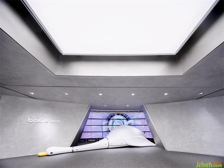 搭乘通往二層的“時空隧道”,探險者們從“艙外”進入到飛船“內(nèi)艙”,立品在“隧道”盡頭利用新媒體動態(tài)宣示先鋒的場所精神。由92塊小屏幕構(gòu)成的屏幕矩陣和巨型的「波思鵝」IP造型增加了后續(xù)體驗的不確定性。屏幕反復(fù)播放bosie「SPACE」視覺概念動態(tài)視頻,讓人如同進入到飛船駕駛艙,立品通過一個混沌、奇幻、未來的異世界營造強烈的時空錯位之感。