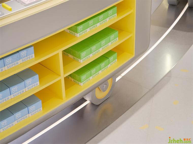 門店除承載售賣功能外,還設(shè)置了可供不同場景使用的“超級實驗室”,通過舉辦不同的手作課幫助品牌和消費者建立更緊密的互動。可自由組合的桌椅帶來品牌和消費者在空間使用的靈活性,裝修設(shè)計透過溫暖明快的亮黃色玻璃,內(nèi)外空間有了更通透的視覺延展性。在空間腳本中,這里還是植物培育的監(jiān)測艙,裝修設(shè)計師在墻面上設(shè)計了不同形態(tài)的植物生長監(jiān)測裝置,裝修設(shè)計同時實現(xiàn)了視覺審美和細膩的敘事表達。